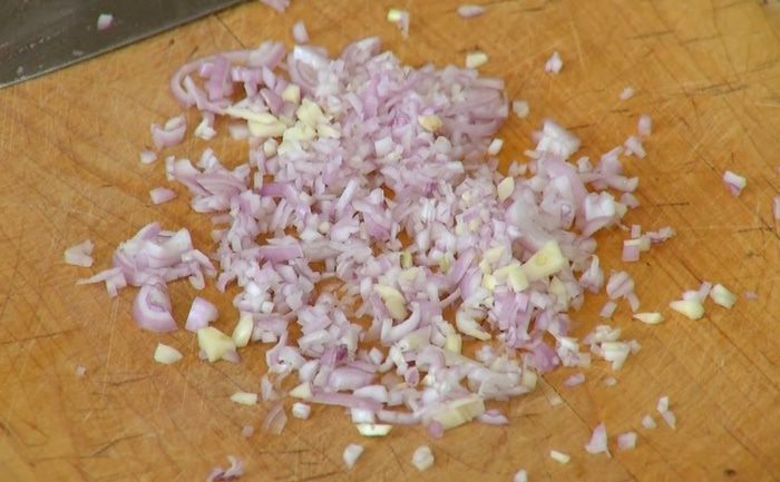 Разогреть в сковороде оливковое масло и обжарить лук и чеснок до легкого золотистого цвета.