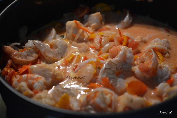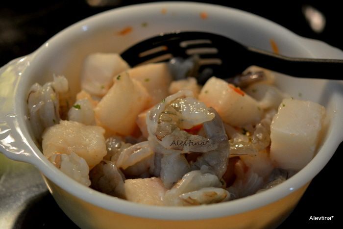 Очистить креветки свежие или размороженные. Филе белой рыбы порезать кубиками. Смешать в стеклянной емкости 2 ст.л сок лайма, 1/2 ч.л, соус Табаско и соль (вместо соли я использую овощную заправку на соли). Выложить креветки и рыбу в стеклянную емкость и перемешать все вместе. Поставить, прикрыв сверху в холодильник на 30 мин.
