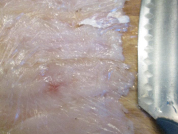 Тонко нарезаем филе судака, примерно 6 х 8 см, накрываем пленкой, сложенной вдвое, и ребром ладони деликатно отбиваем, чтобы толщина кусочков стала 2 — 3 мм.