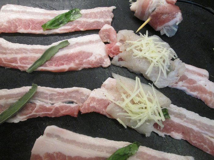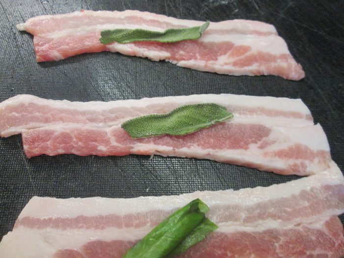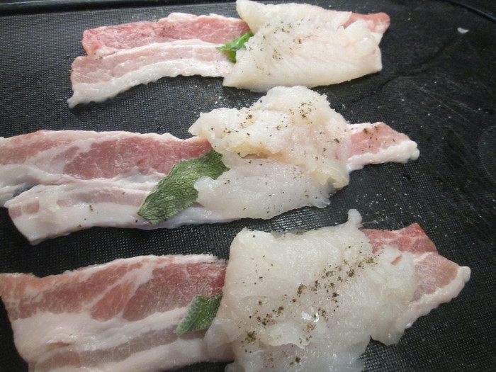 Приправляем филе перцем. Кладем на доске кусочки бекона, на них — листики шалфея или базилика.