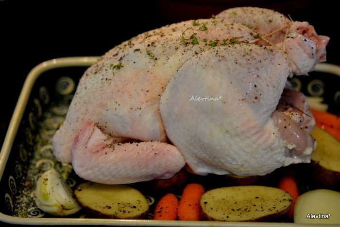 Курицу вымыть, промокнуть внутри и снаружи. Посолить внутри, поперчить, затем ножки закрепить специальным кулинарным шпагатом. Так они не подгорят, крылышки нижняя часть срезать. Посолить и поперчить сверху, можно положить в полость веточки тимьяна. Посыпать сверху листьями тимьяна. Положить поверх овощей.
