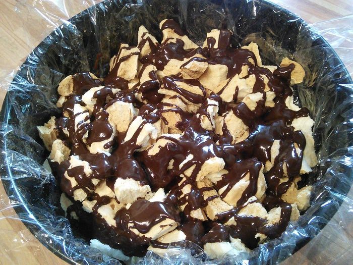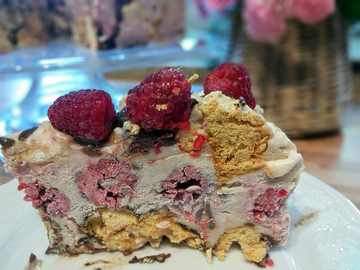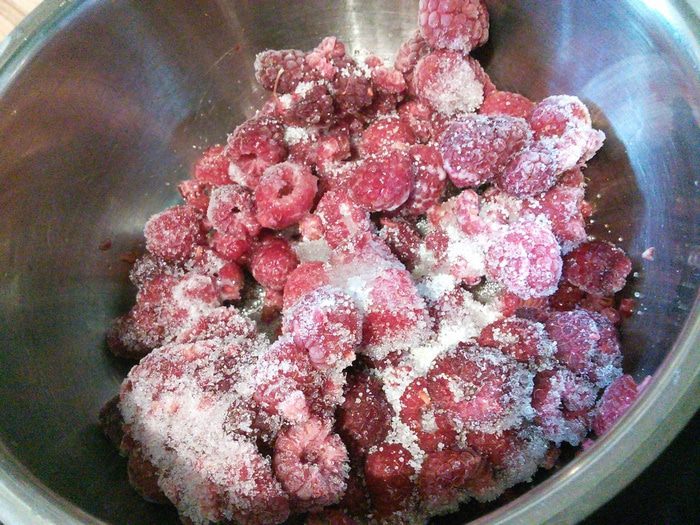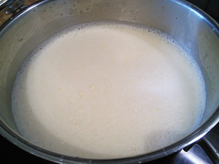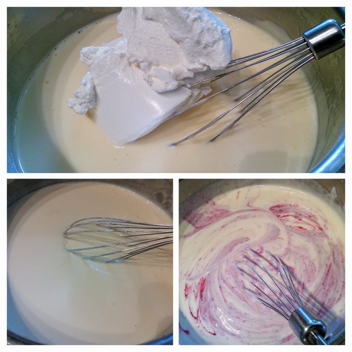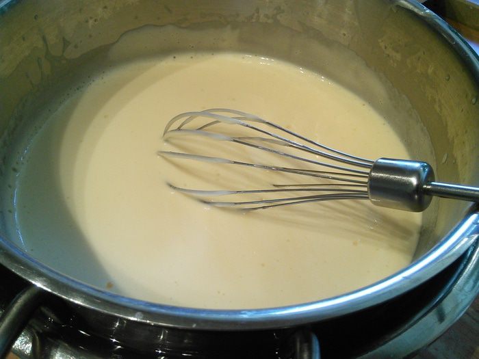 Перелить всю массу в кастрюлю и на среднем огне, постоянно помешивая довести смесь до загустения. Как только вы почувствуете сопротивление венчику, крем готов. Идеальная температура крема 80-84°C, но не выше, иначе яйца превратятся в омлет. Снять с огня и поставить на ледяную баню для быстрого охлаждения, некоторое время необходимо помешивать крем, чтобы он не свернулся. Охладить до комнатной температуры.