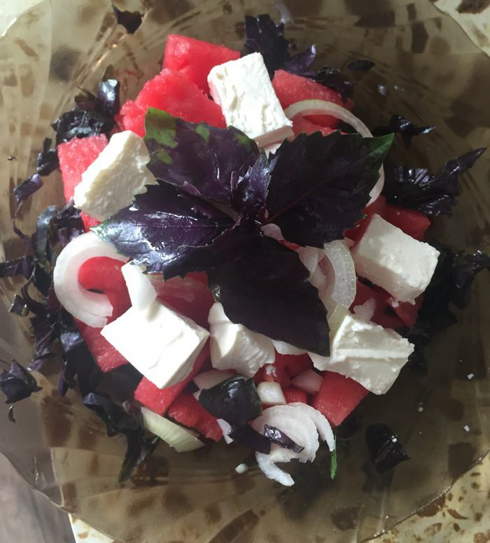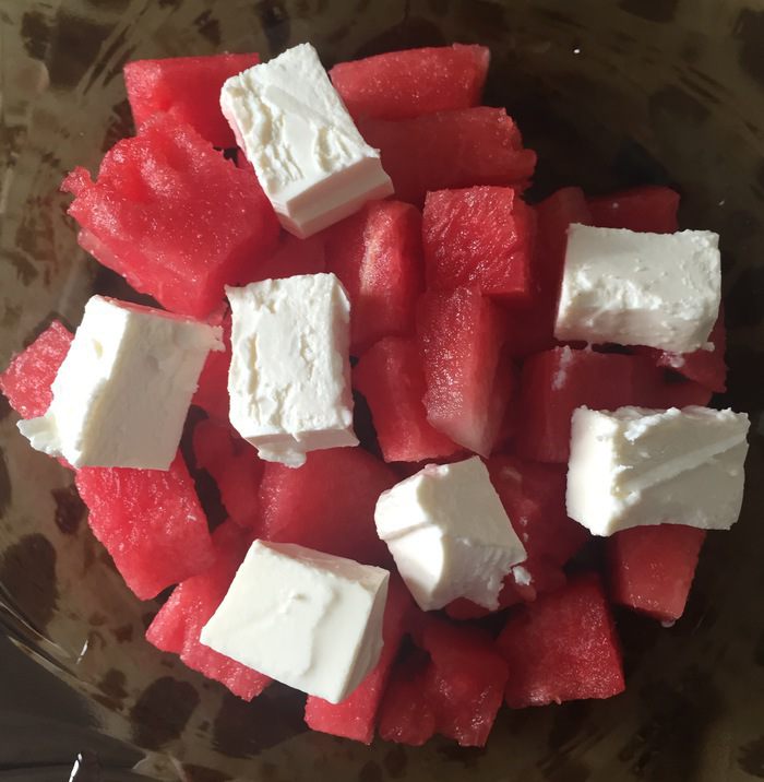 Также нарезать сыр Фета кубиками и положить на арбуз.