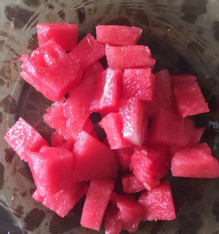 Нарезаем мякоть арбуза на кубики, удаляя все косточки.
