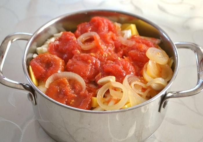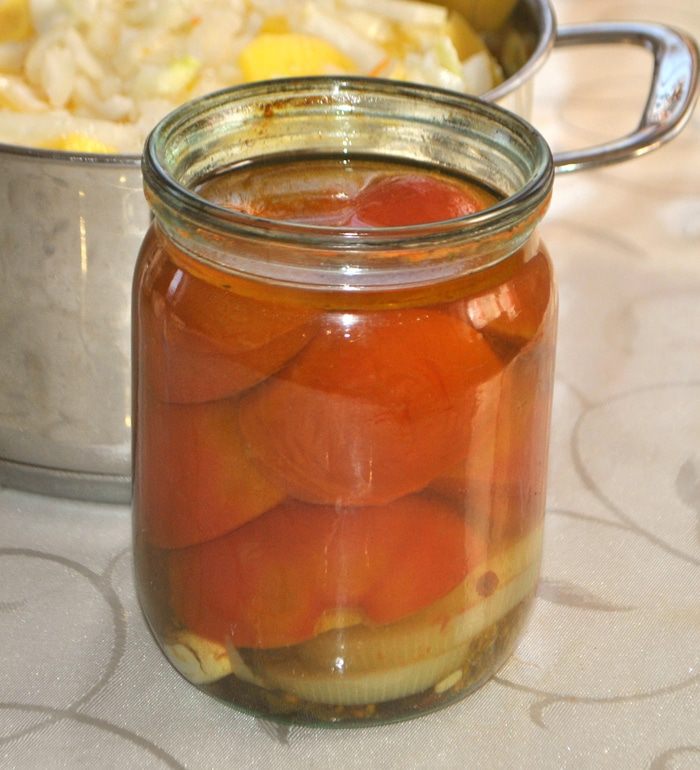 С помидор снять кожицу. Выложить последним слоем и вылить весь рассол из банки.