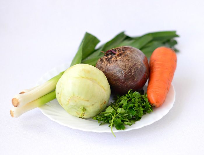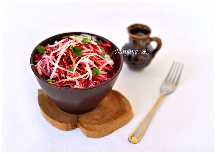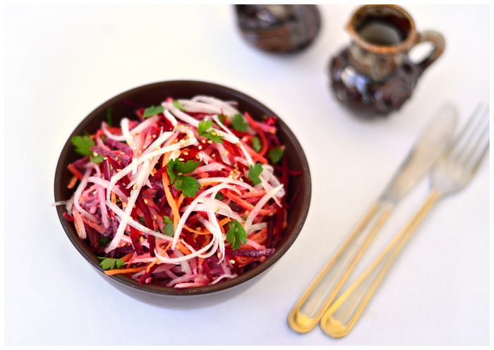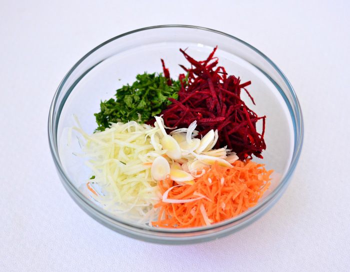 Натереть на крупной терке или на терке для моркови по-корейски кольраби, свеклу, морковь. Петрушку мелко порезать. Лук-порей (белую часть) порезать соломкой. Для тех, кто не любит острые салаты или вообще не любит в салатах лук, его можно не добавлять. Чтобы свекла не окрасила в салате морковь и кольраби, можно предварительно сбрызнуть ее растительным маслом, перемешать и только потом добавлять в салат.