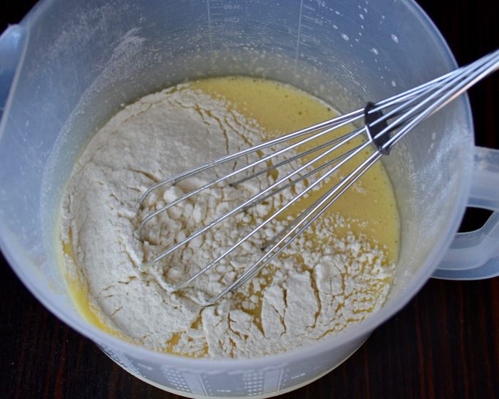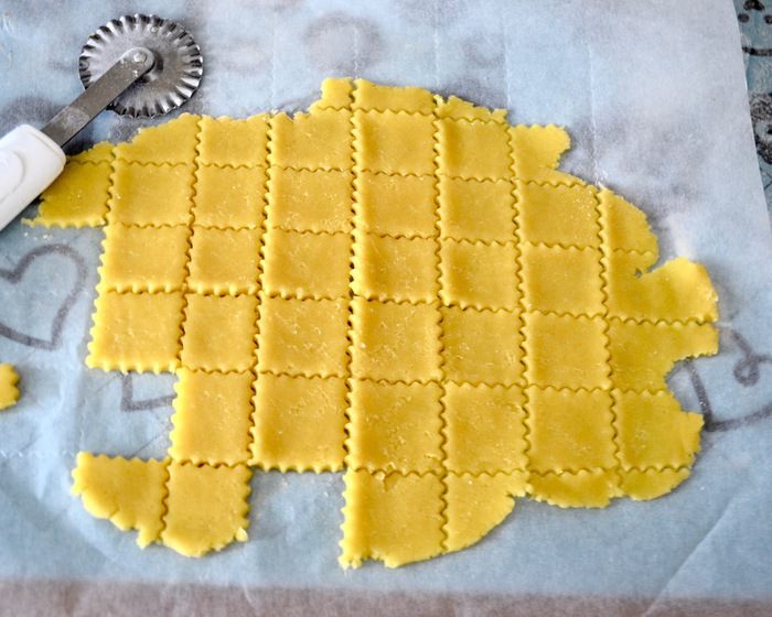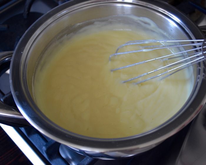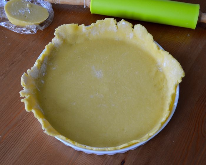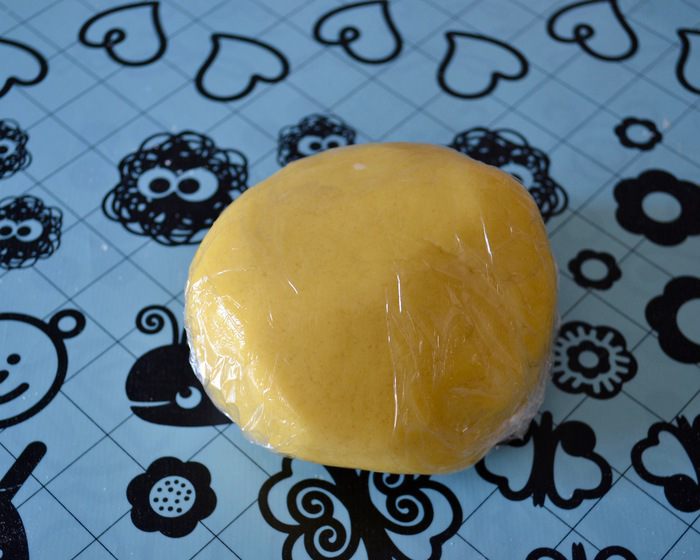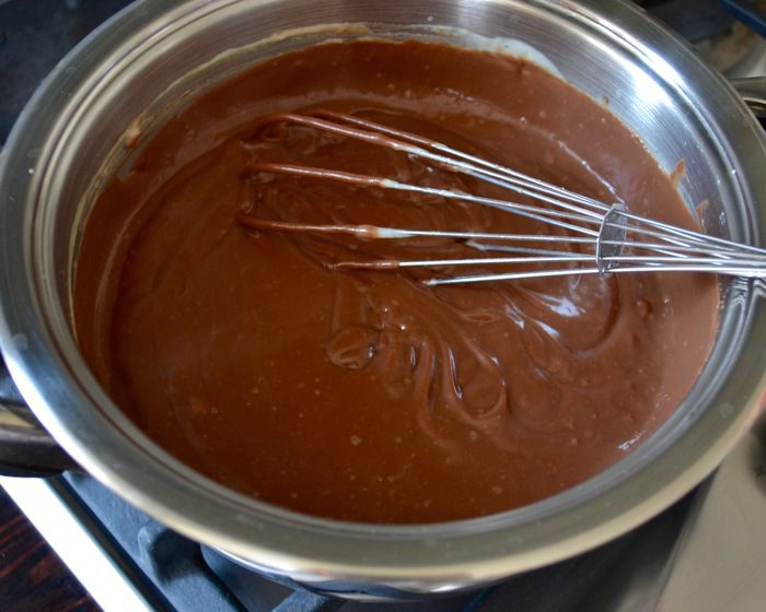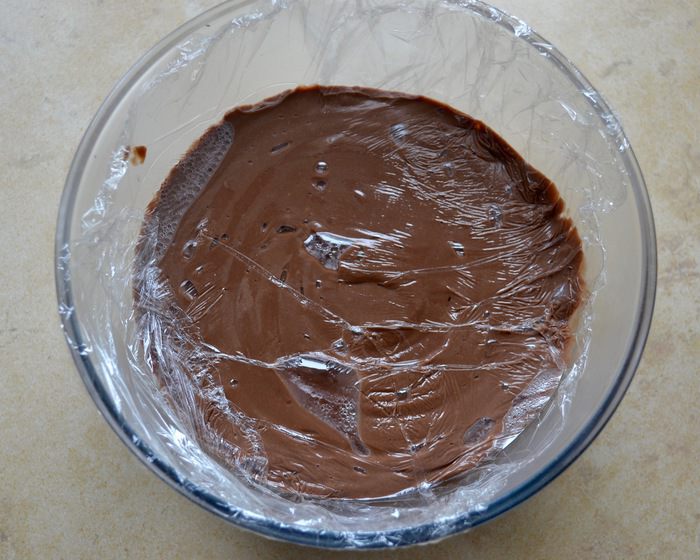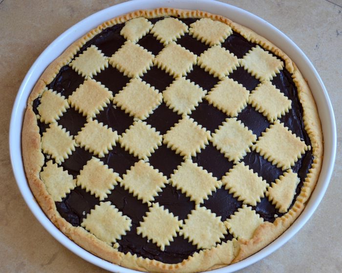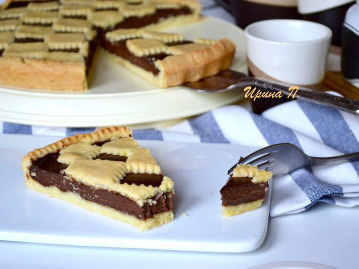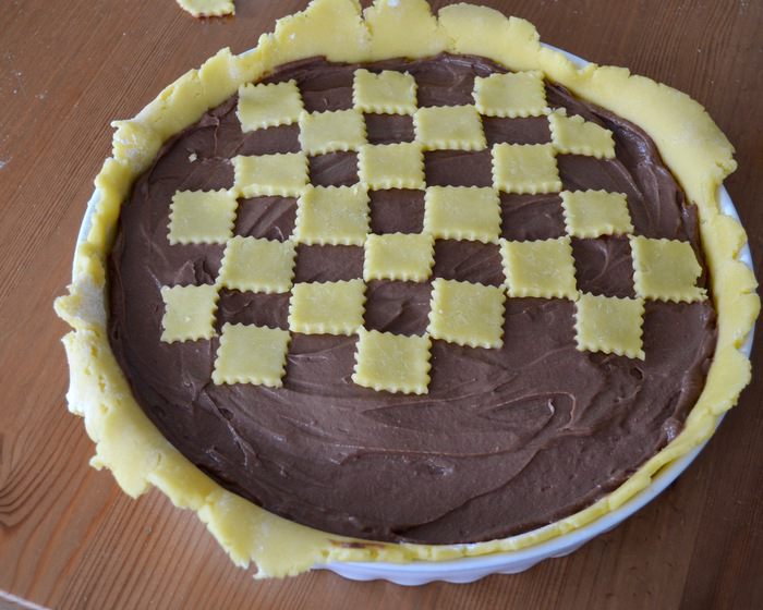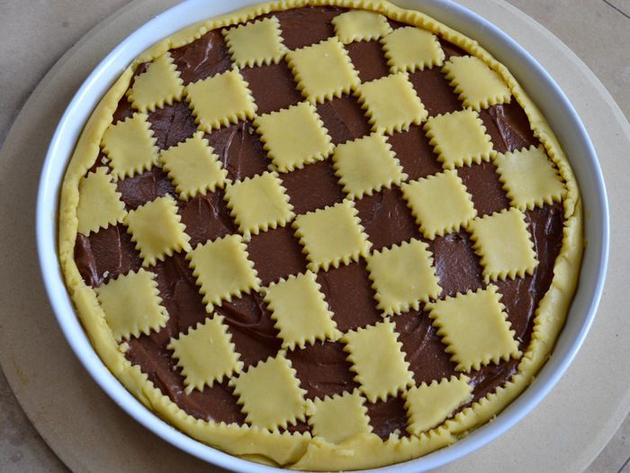 По истечении указанного времени, выложить тесто на рабочую поверхность. Отрезать 2/3 от теста, раскатать в пласт толщиной примерно 0,5 см и выложить в подготовленную форму (диаметром 23 — 24 см). Осторожно выложить на тесто шоколадный крем, стараясь распределить его по поверхности как можно ровнее.