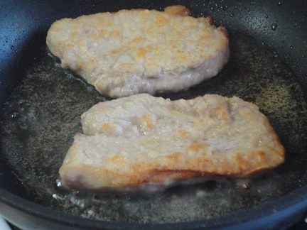 Куски мяса обвалять в муке и обжарить на сильно раскаленном масле до румяной корочки.
