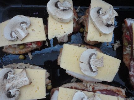 Мясо выложить на противень и покрыть слоем начинки. Сверху положить по кусочку бекона и сыра. Украсить отложенными кусочками грибов.
