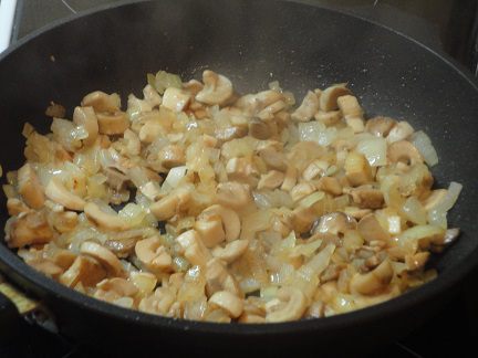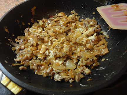 Лук нарезать мелкими кубиками и обжарить до золотистого цвета на 2 ложках растительного масла. Добавить грибы и жарить, пока не испарится жидкость.