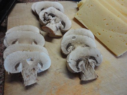 За это время приготовить начинку. Поставить вариться рис. Грибы почистить и нарезать ломтиками, 2 самых красивых отложить, остальные порубить. Сыр и бекон нарезать пластинами.