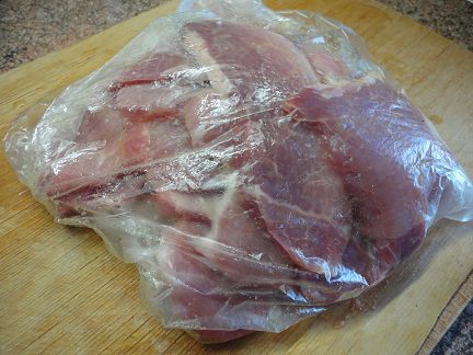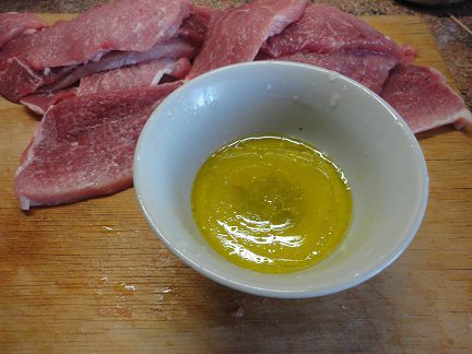 Мякоть свинины или телятины нарезать поперек волокон (по 2 кусочка на порцию), слегка отбить и замариновать в смеси оливкового масла и лимонного сока с душистым перцем.