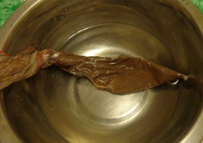 Растопить черный шоколад. Можно сделать это на водяной бане, но лучше прямо в кулинарном мешке, залив его горячей водой, чтобы потом не возиться с переливанием и не пачкать шоколадом все вокруг. Потом сделать в мешке отверстие и спокойно работать. Если использовался не весь шоколад из мешка, можно закрыть отверстие прищепкой и так хранить до повторного употребления.