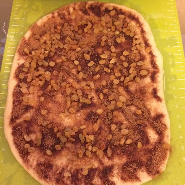 Раскатать тесто, смазать растопленным сливочным маслом. Посыпать корицей с сахаром. Изюм отжать и выложить сверху на тесто.