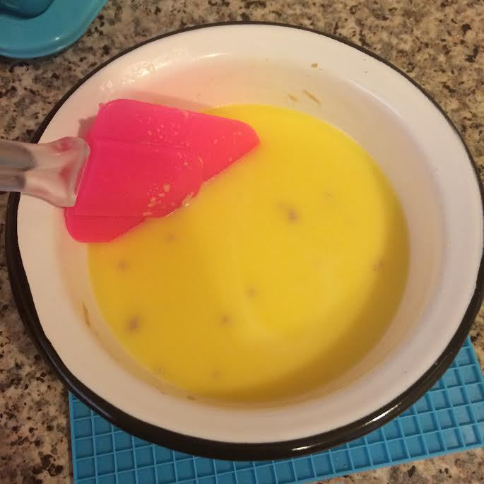 Добавить молоко в яичную смесь и перемешать на первой скорости.
