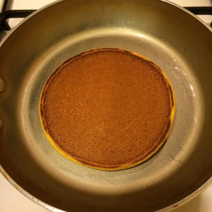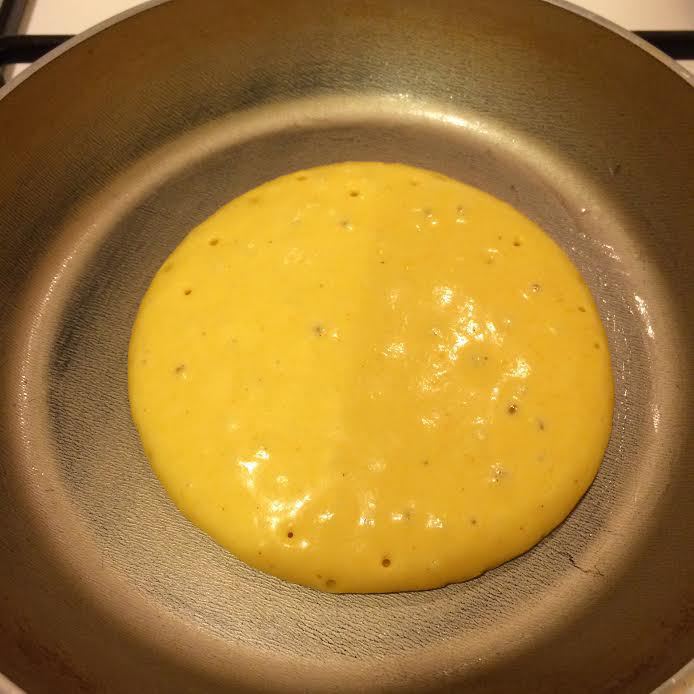 Разогреть сковороду, смазать ее слегка маслом, выложить тесто и жарить, пока на поверхности не образуются пузырьки.