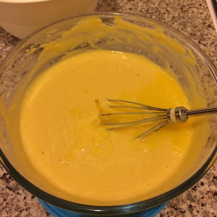 Добавить растопленное сливочное масло, хорошо перемешать. Теперь смешать жидкие ингредиенты с сухими и хорошо перемешать венчиком.