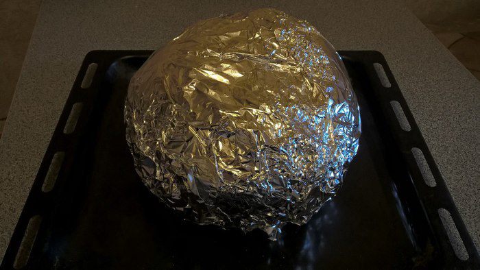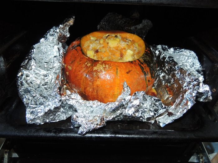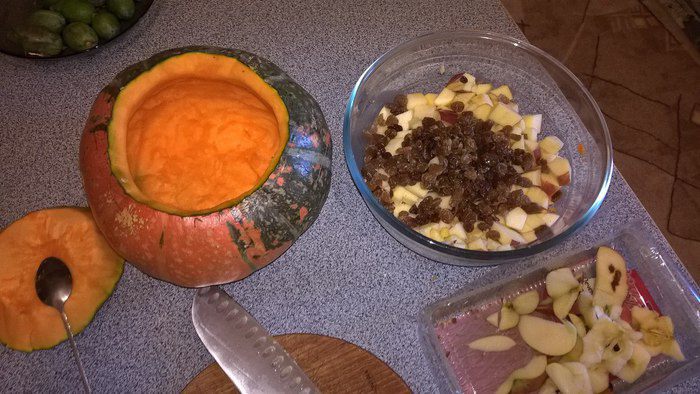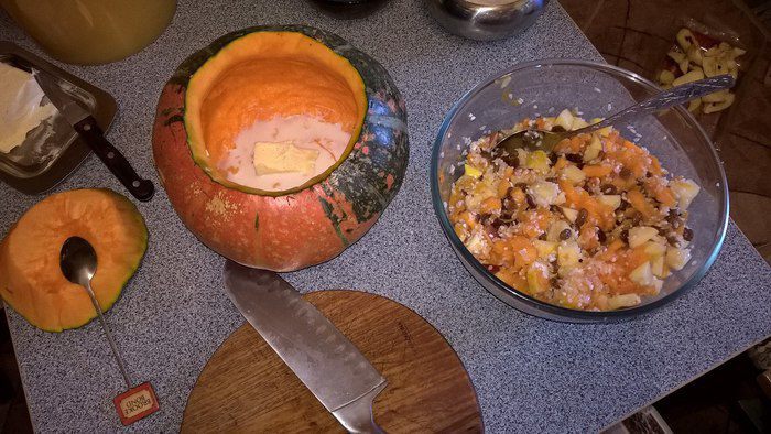 Берём небольшую тыкву, срезаем конусом верхушечку (она будет служить нам крышечкой), вычищаем тыкву от семечек. Срезаем немножко мякоти и измельчаем её, кладём в миску для смешивания. Добавляем к мякоти порезанные кубиком яблоки, изюм (замачиваю в горячей воде, чтобы стал мягким), рис (промываю, а потом на 5 минут заливаю кипятком, чтобы был в каше не клейким), мёд (я использую разнотравье, можно растопить на водяной бане, чтобы смешивать удобнее).