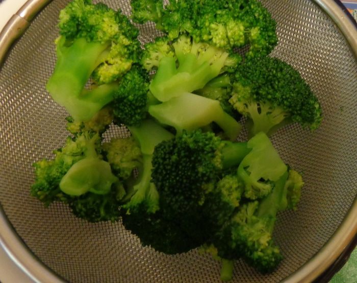 Замороженную капусту разморозить и слегка отварить. Откинуть на сито, дать стечь всей воде.