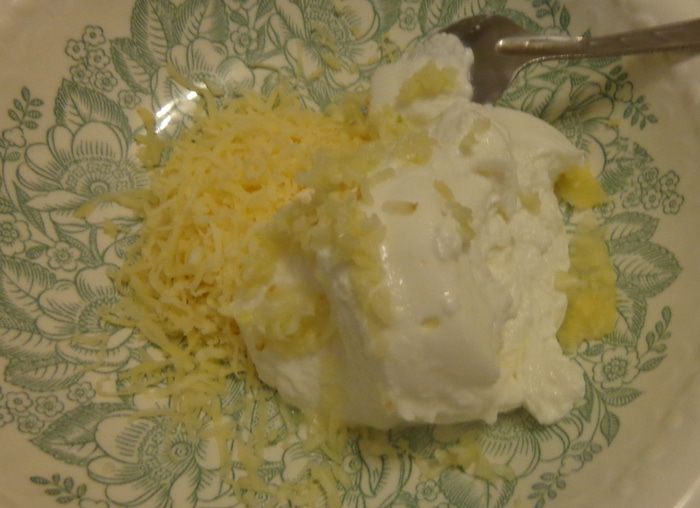 Тем временем сделать начинку: натереть сыр и чеснок, добавить творог и все хорошо размешать.