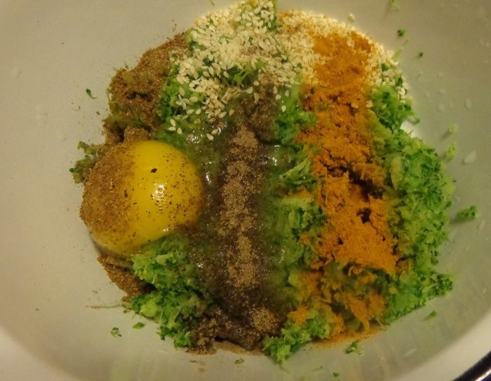 Добавить яйцо, кунжут, соль, перец и любимые специи. Перемешать и всыпать горсть муки. Получится мягкое "тесто".