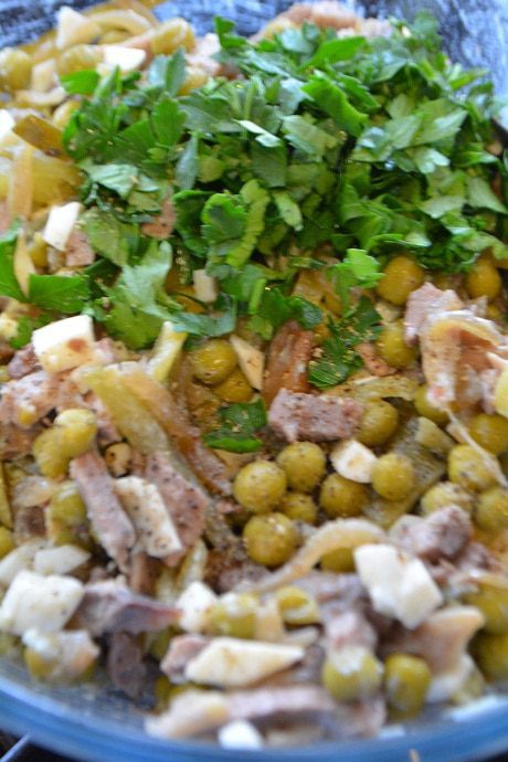 В салатнике смешиваем язык, грибы обжаренные с луком, огурцы, яйца, горошек, измельченную петрушку. Посолить, поперчить, заправить майонезом и перемешать.