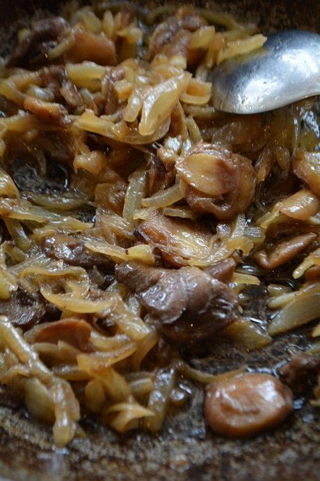Лук порезать полукольцами, обжарить на растительном масле пару минут. Добавить порезанные шампиньоны и жарить еще 5-7мин. Посолить и поперчить. Остудить.