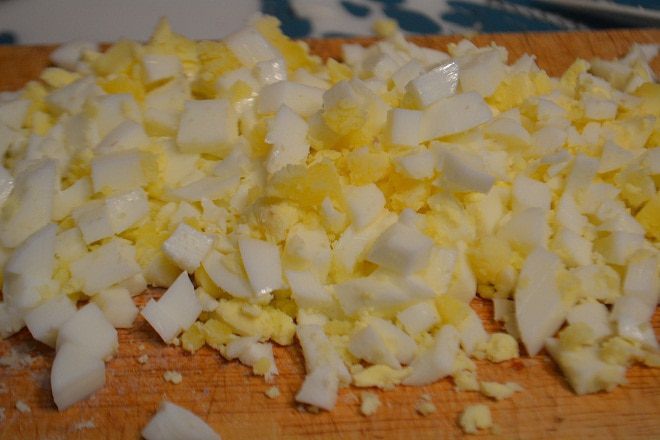 Яйца отварить 8 минут на среднем огне. Охладить и нарезать кубиками.
