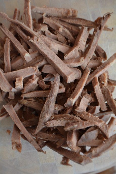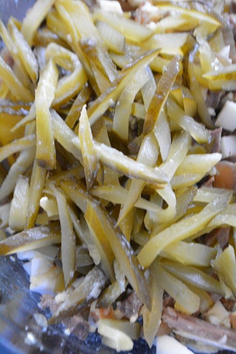 Заранее отварить язык (2-3 часа), залить холодной водой и очистить. Нарезать соломкой.