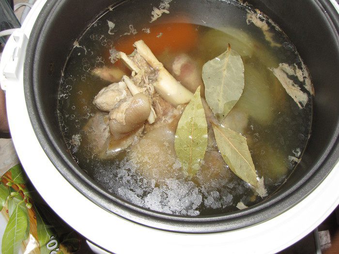 Готовить в режиме «суп» два часа. Затем добавить лавровый лист и готовить еще пол часа.