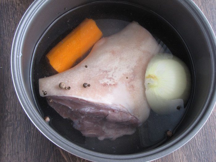 Свиную рульку хорошо вымыть, положить в чашу мультиварки, добавить холодную воду, чтобы закрыть мясо. Положить лук, морковь, перец горошком и душистый перец, посолить.