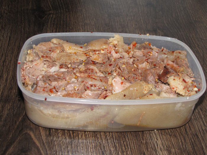 Взять подходящую по размеру емкость и выложить рульку, добавить пару ложек бульона, в котором варилась рулька. Я обычно использую одноразовые формочки из фольги, но в этот раз формочек не было, и я выложила рульку в пластиковый контейнер.