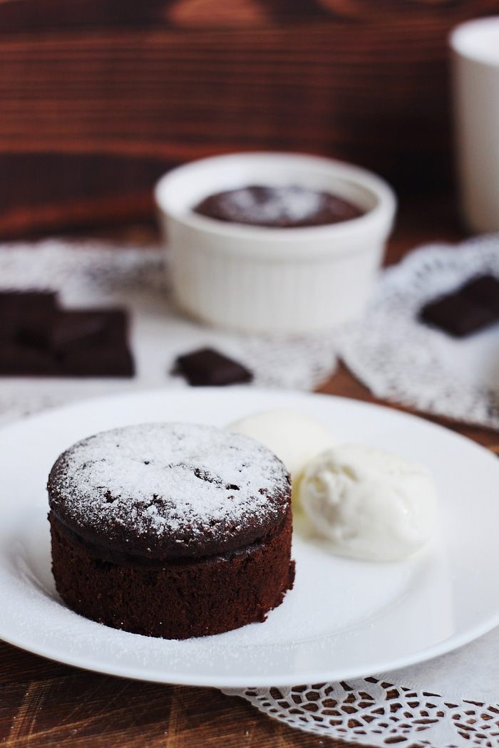 Выпекать при 180°C 8-10 минут. Фондан готов, когда тесто по краям поднялось, а в серединке еще видна ямочка. По опыту могу сказать, что не всегда эта ямочка есть, поэтому смело доставайте фондан через выше указанное время — и будет вам счастье.