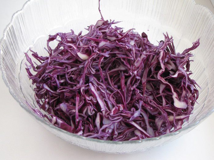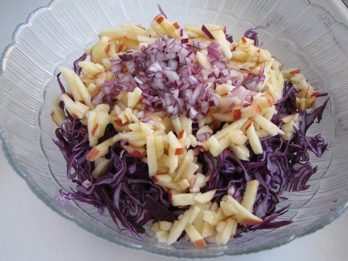 Яблоко нарезать соломкой, сбрызнуть лимонным соком, чтобы не потемнело. Лук измельчить, соединить с капустой.