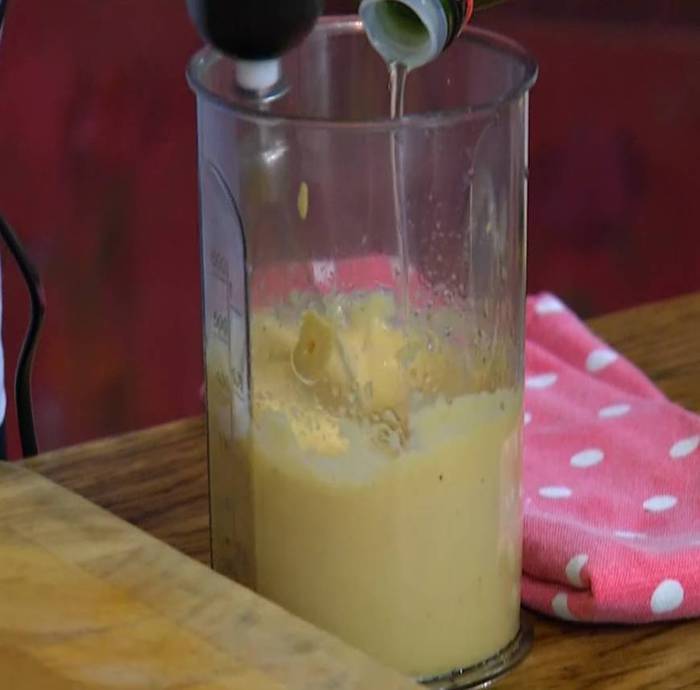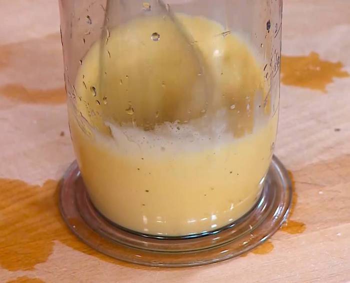 Добавить 1 ст. ложку лимонного сока, затем, непрерывно взбивая венчиком, по капле влить 100 мл оливкового масла.