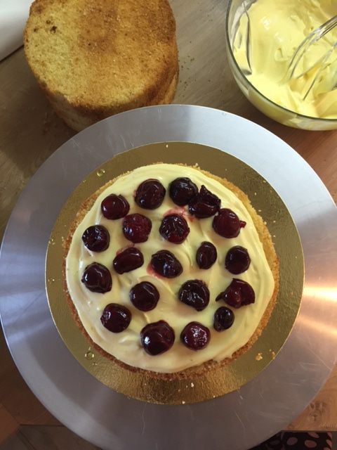 На корж выкладываем крем и вишню (можно замороженную, можно свежую).