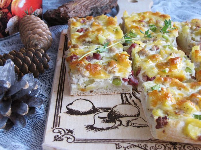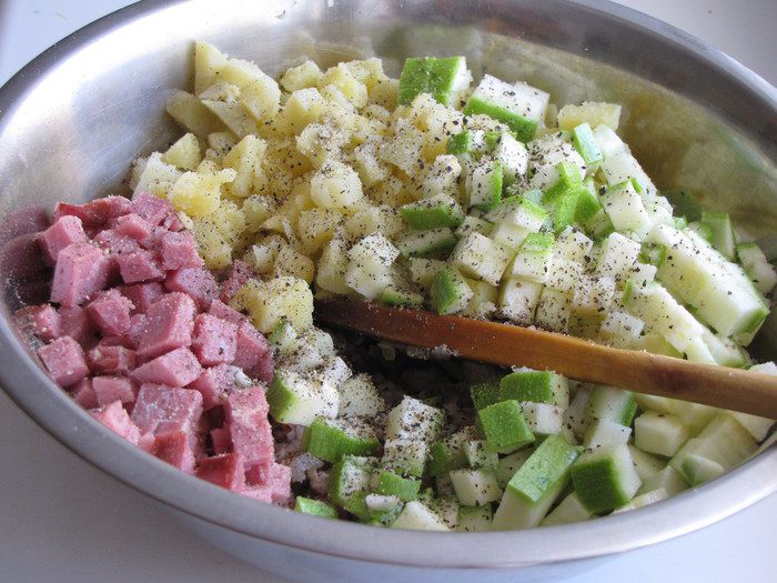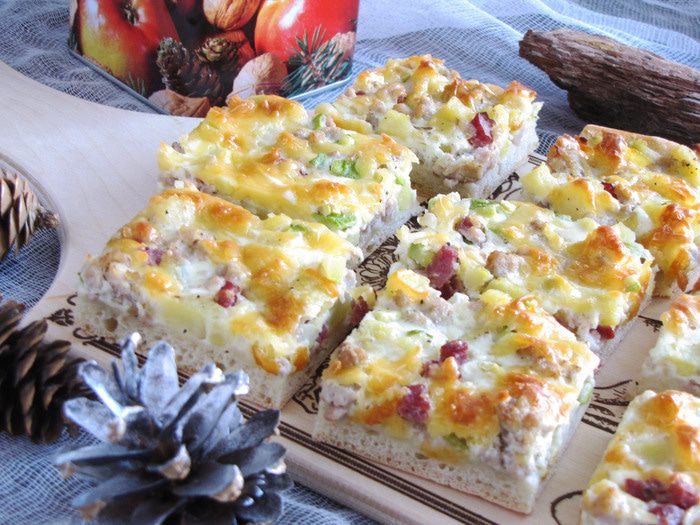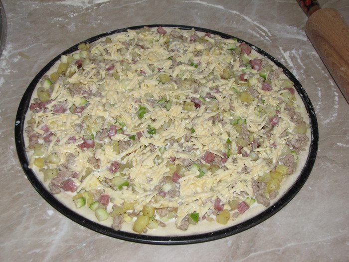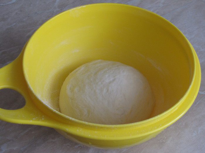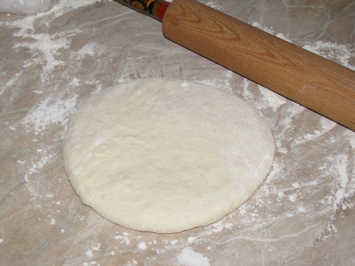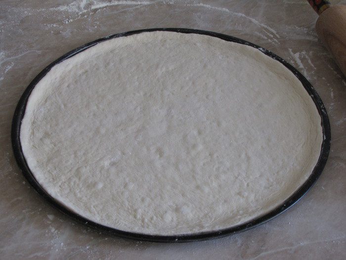В миску просеять муку, добавить соль, сахар, оливковое масло (можно растительное). Влить воду с дрожжами и замесить мягкое тесто. Тесто месить минут десять, пока не перестанет липнуть к рукам. Собрать тесто в шар и положить в миску, подпыленную мукой. Накрыть тесто пленкой или полотенцем, убрать в теплое место для подъема.