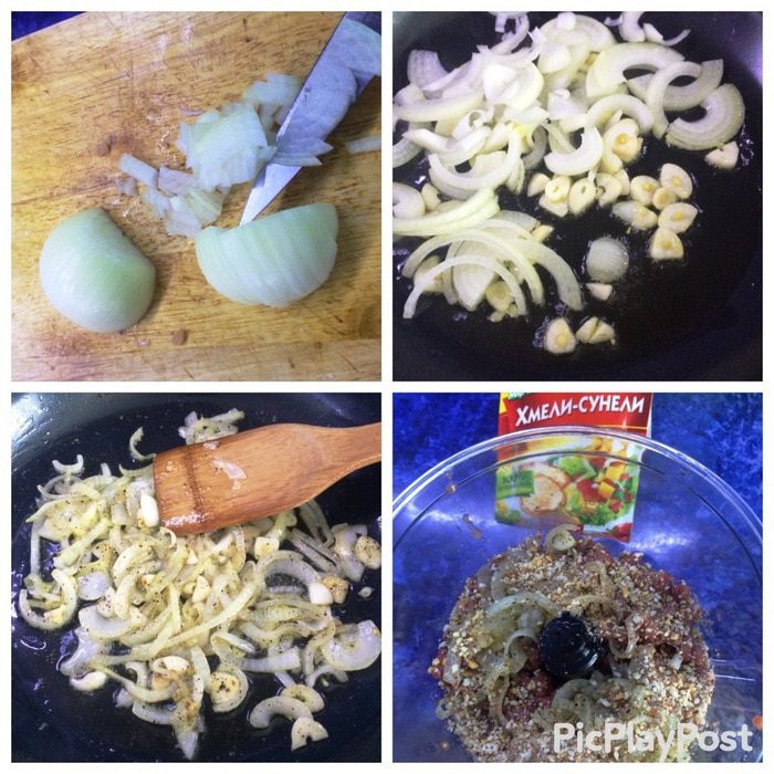 Консервированную красную фасоль (у меня была в наличии, думаю можно и самим отварить) выкладываем в блендер, туда же отправляем жаренный лук с чесноком, добавляем хмели-сунели и размельчаем в пасту.