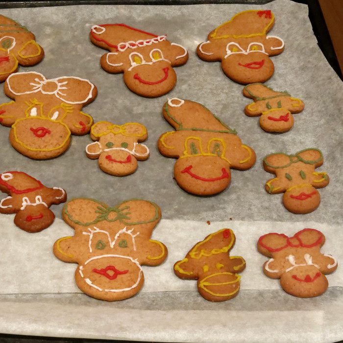 Выпекаем при 180°C 10-12 минут. Еще немного чудес и усердия: рисуем бантик, мордочку, ушки, серьги, — девочка-обезьянка готова. Рисуем шапочку, кисточки, помпоны и пр, глаза, рот, ушки — фигурка мальчика-обезьянки готова. Маленькие формочки — маленькие обезьянки. Укладываем обезьянок в коробочки — подарок готов!