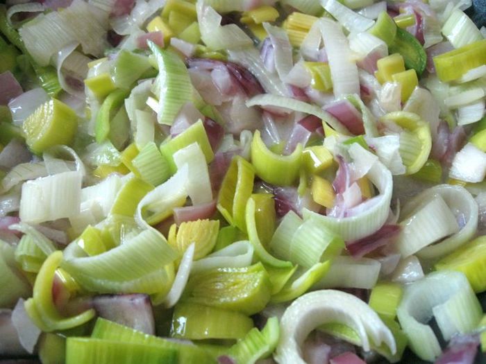 Лук (красный и порей) порезать на кусочки, обжарить до прозрачности (не долго, несколько минут) на оливковом масле, в процессе обжарки добавить сливочное масло.
