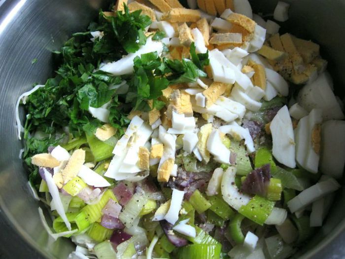 Петрушку порезать мелко. Яйца порезать.