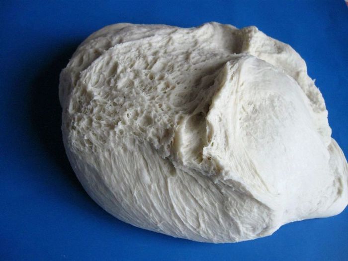К опаре добавить муку с солью и сахаром. Добавить воду (ваша мука может взять чуть меньше или больше воды). Замесить тесто. В конце добавить оливковое и сливочное масло. Оставить под полотенцем примерно на два часа (то есть до времени максимального подъема).