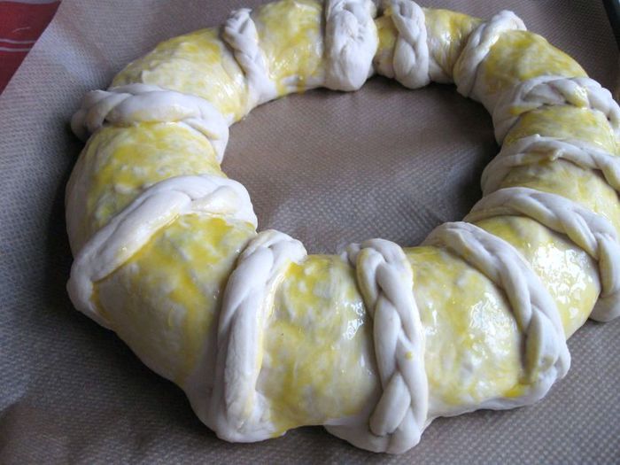 Смазать кисточкой желтком, смешанным с молоком, промежутки из гладкой части теста, минуя косички. Можете, конечно, и косички смазать желтковой смесью. Как вам больше нравится.