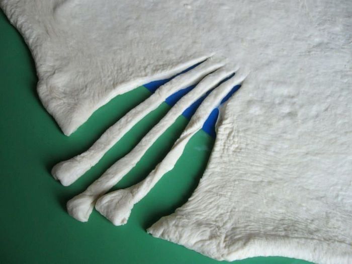 Посыпать поверхность немного мукой. Раскатать скалкой пласт овальной формы. С одного края сделать три глубоких разреза.