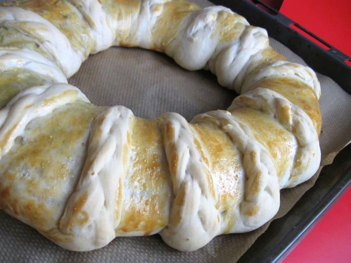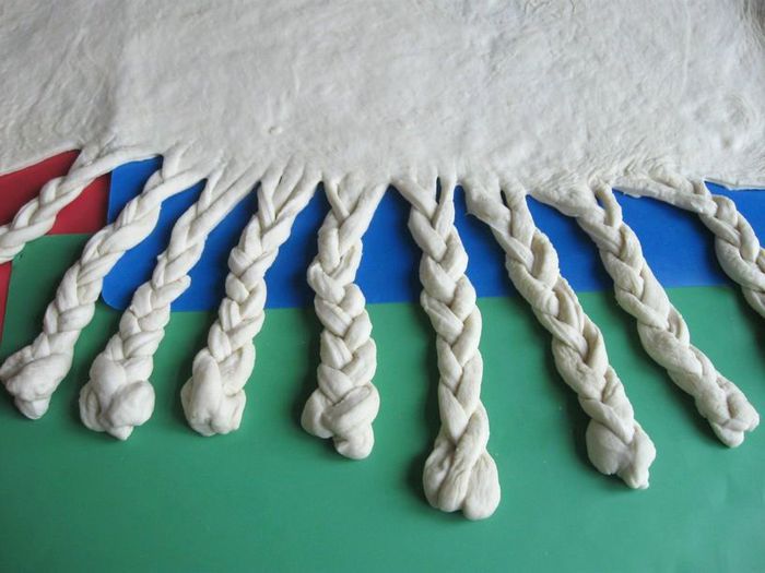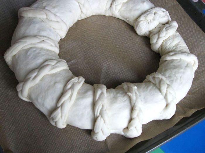 Сплести из теста одну косичку, затем сделать еще разрезы и сплести другую.