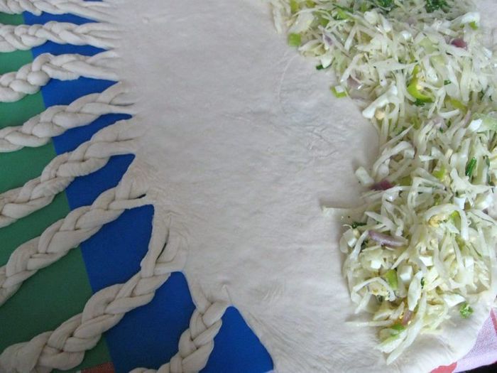 Духовку разогреть до 200°С. На противоположную от косичек сторону теста положить начинку.