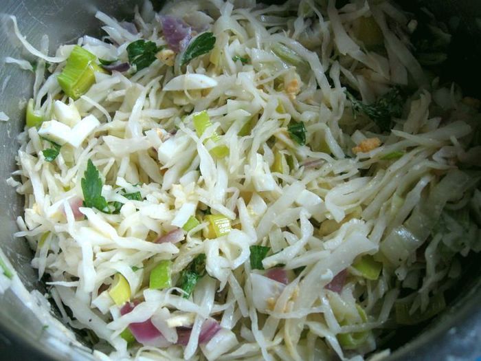 Смешать все компоненты для начинки (яйца, капусту, петрушку, лук), посолить, добавить сахар, перец.