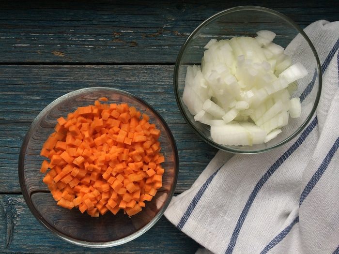 Морковь и лук очистите и нарежьте на мелкие кубики.