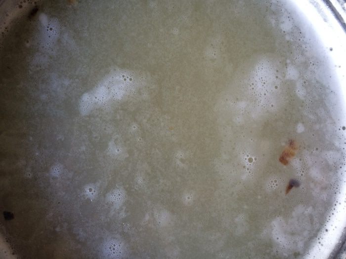 Доведите до кипения куриный бульон, добавьте утиную грудку (без кожи) и снова доведите до кипения.