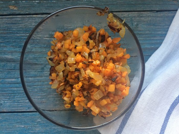 Разогрейте масло в сковороде и обжаривайте лук и морковь до золотистого цвета. Затем добавьте пассерованные овощи в суп.